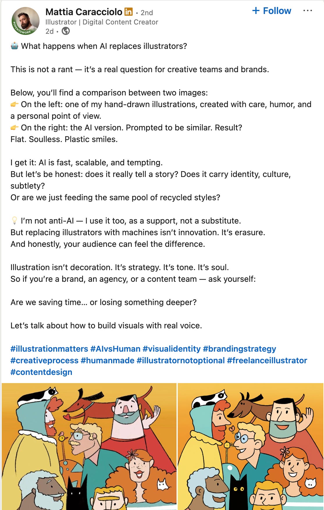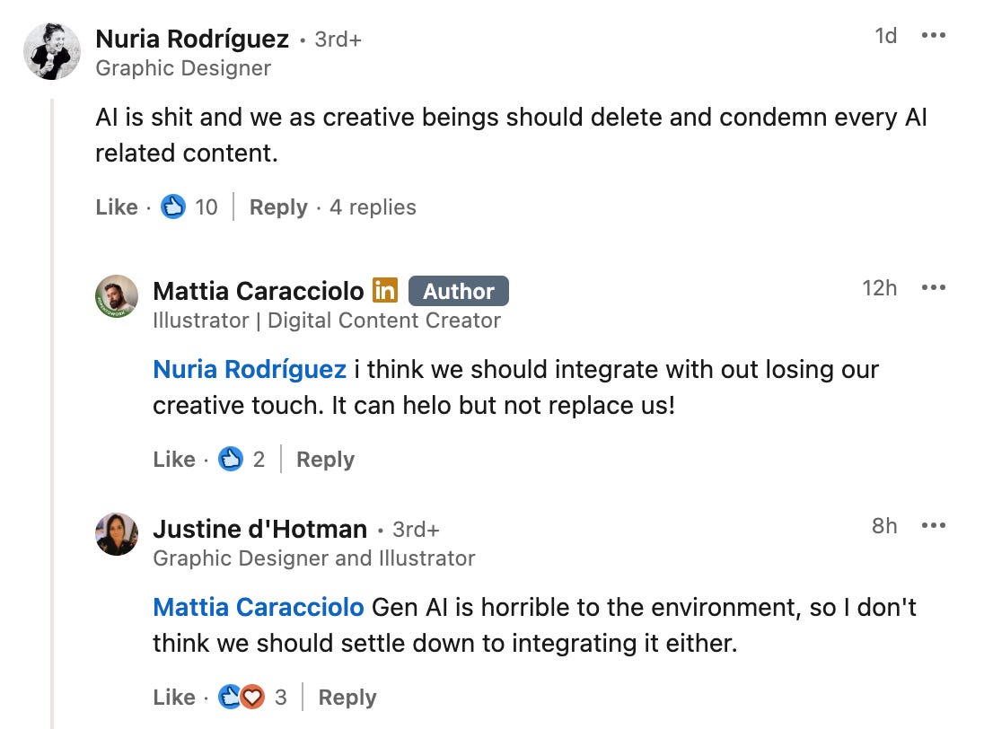 There are many in fields currently being swept away that are investing in re-skilling. Meanwhile, there’s others who are trying to embrace it, but (in my view) are still too attached to their craft. You can already see these tensions playing out in creative fields like design and illustration. Look at this post, for example - and it’s actually a fairly moderate example too: