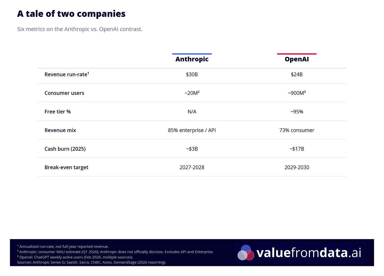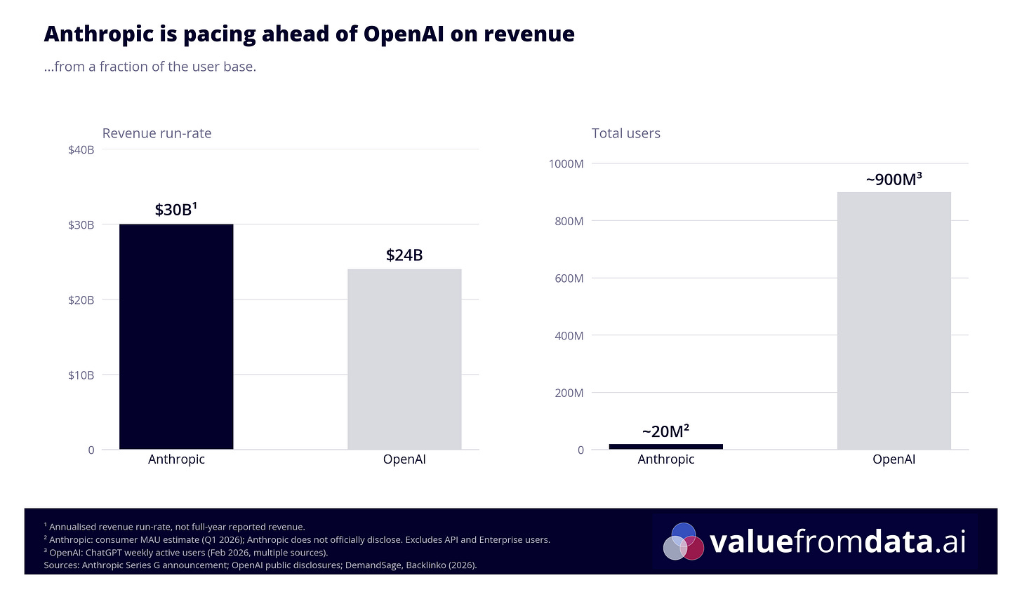 Anthropic’s annualised revenue run-rate has hit $30 billion. OpenAI’s is at $24 billion. Anthropic is generating more revenue - with a fraction of OpenAI’s user base.