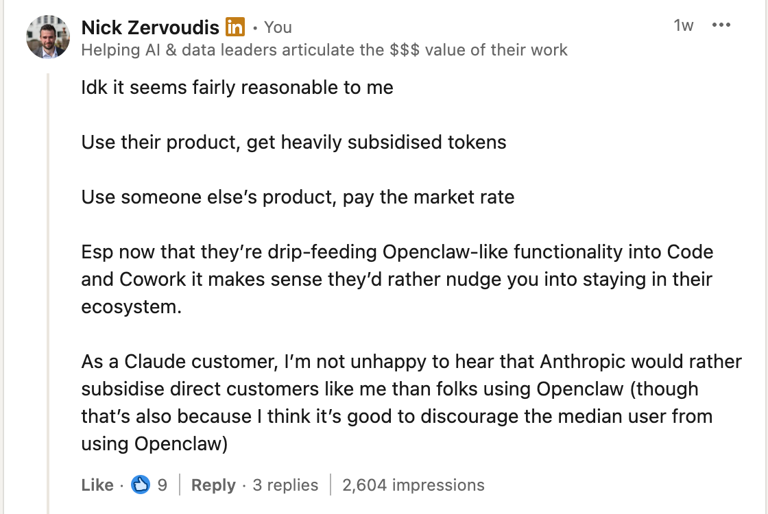 The restriction on third-party harnesses is reasonable. I said as much in a LinkedIn comment when it happened: use their product, get heavily subsidised tokens; use someone else’s product, pay the market rate. Especially now that Anthropic is building OpenClaw-like functionality into Code and Co-Work, it makes sense they’d rather subsidise direct customers than folks routing through third-party tools.