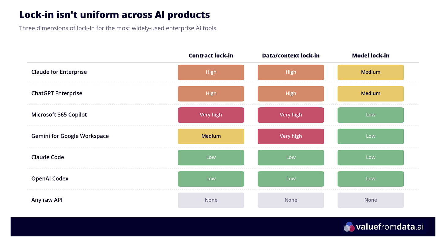 The table below isn’t exhaustive, but it illustrates how different this looks across the most widely-used products. The pattern that stands out: Microsoft has deliberately kept model lock-in low (multi-model strategy: GPT, Claude, and Gemini all available via Copilot) while maintaining very high contract and data lock-in through enterprise licensing and the M365 ecosystem. That’s a smart platform play - they don’t need to win on models, because the platform is already indispensable.