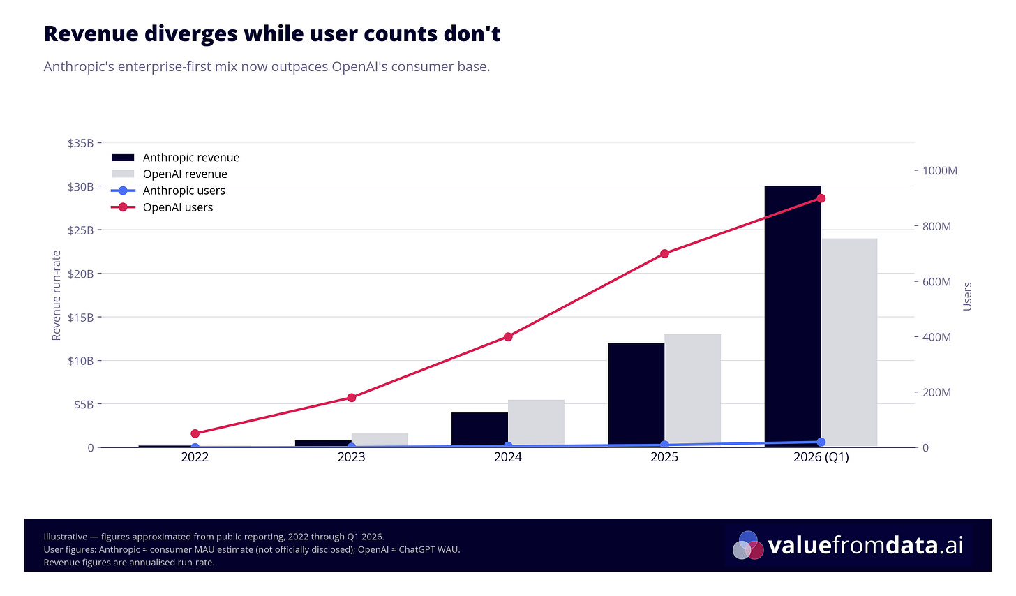Anthropic generates more revenue than OpenAI with a fraction of the users, by going after Enterprise deals.