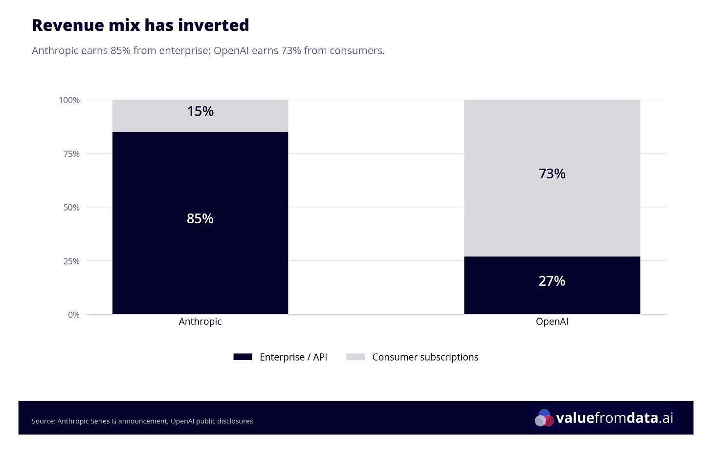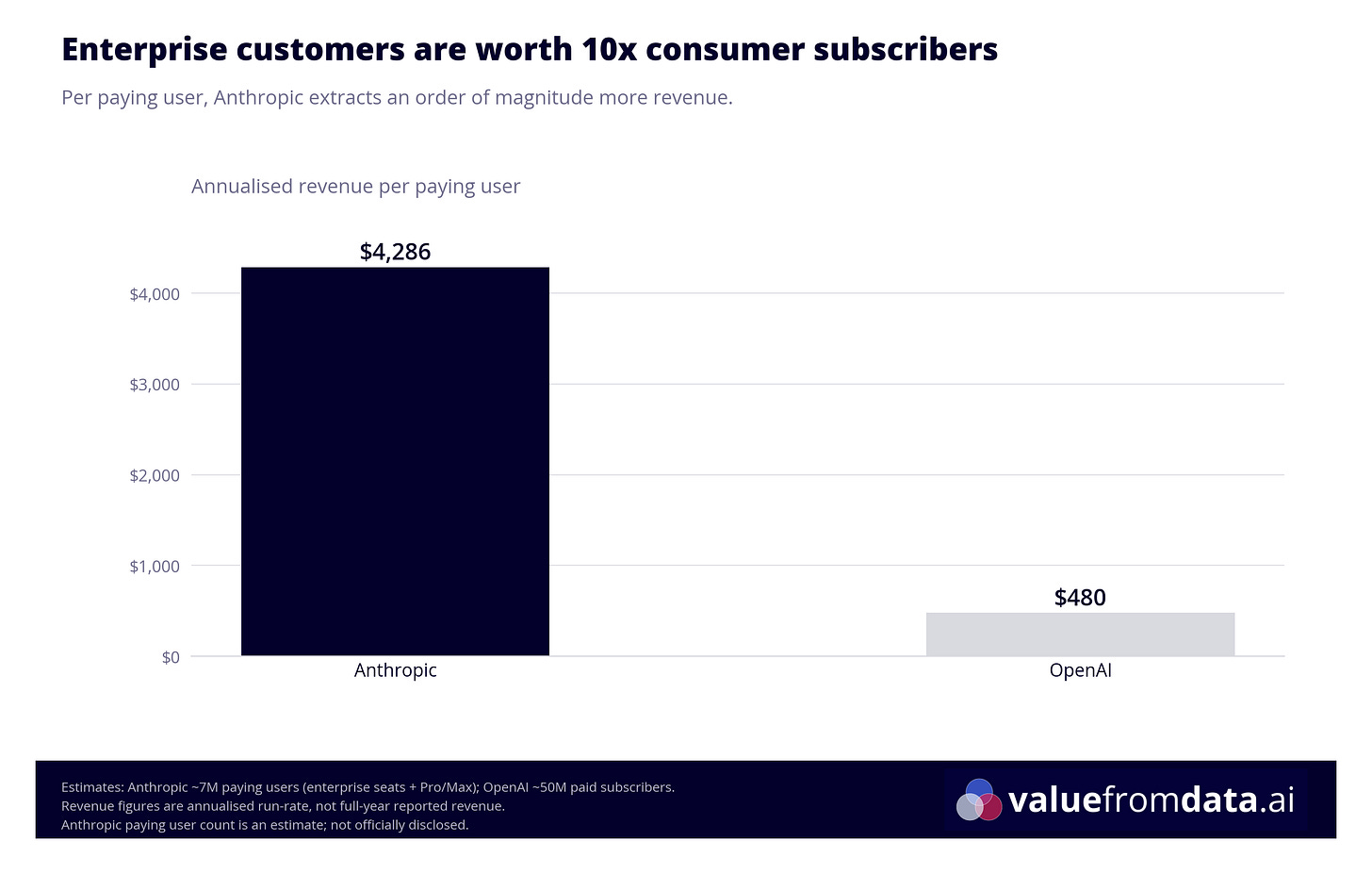 Granted, the comparison isn’t perfectly apples-to-apples: Anthropic’s enterprise and API customers are burning tokens at industrial scale, not uploading images of their dog to generate Studio Ghibli pictures (which, for the record, my mum has done approximately eleven times on ChatGPT’s free tier). But the direction is clear: enterprise customers are dramatically more valuable than consumer subscribers, and Anthropic has built its entire business around them3.